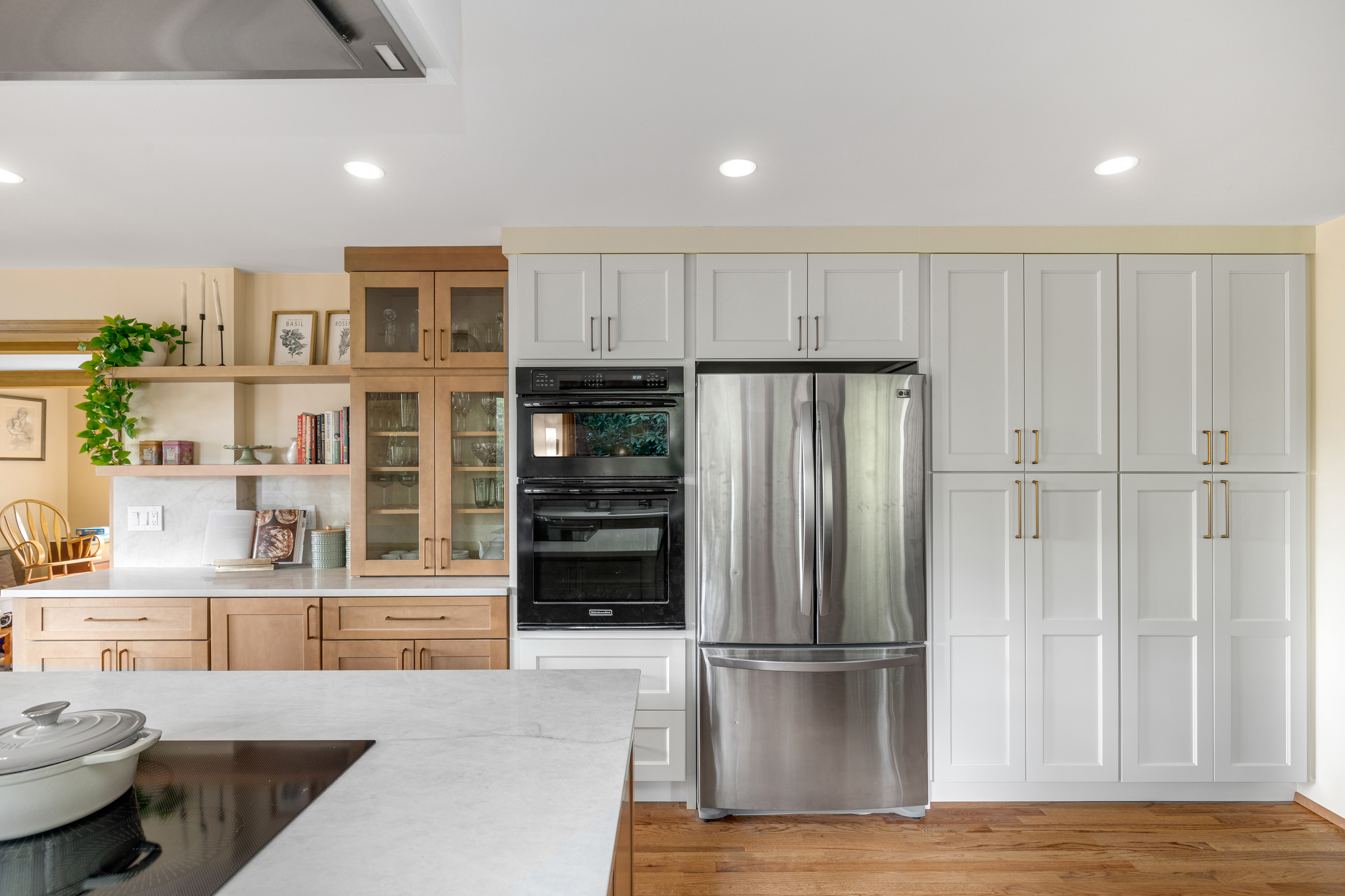 Hardware Contrast: Classic cabinet silhouettes mixed with stunning, modern hardware to offer a curated point of contrast.